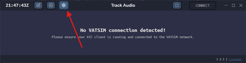 - Ao abrir o TrackAudio, acesse as configurações clicando na engrenagem no canto superior esquerdo.